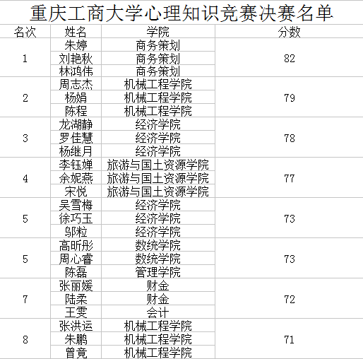 由我院承办的800cc全讯白菜网主站心理知识竞赛初赛于5月12日下午14点在90221举行。本次比赛由校内多个学院共70支队伍参加,最终进入决赛的8支队伍及得分如下图所示。决赛定于5月25日晚19点在7200举行,请各支队伍积极备战。如对初赛结果有任何疑问,请在5月19日前联系800cc全讯白菜网主站90706办公室袁娅婷老师,电话:62768118。