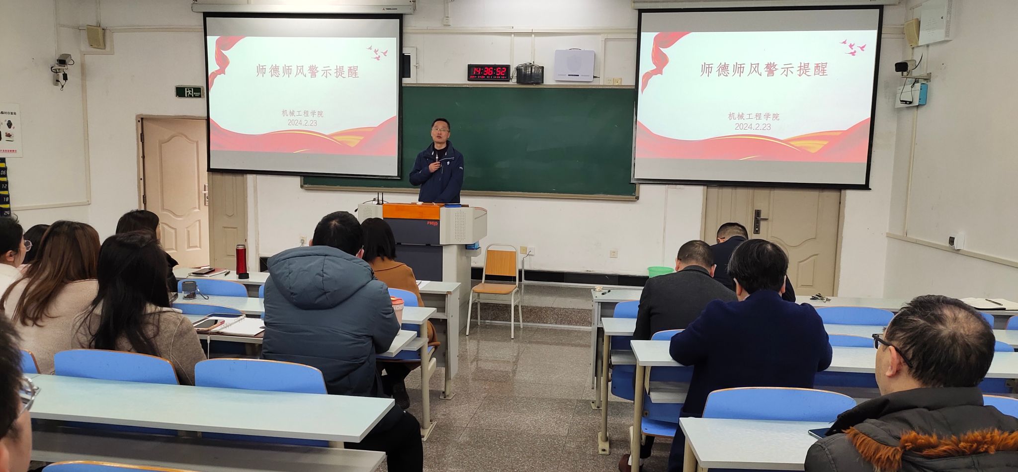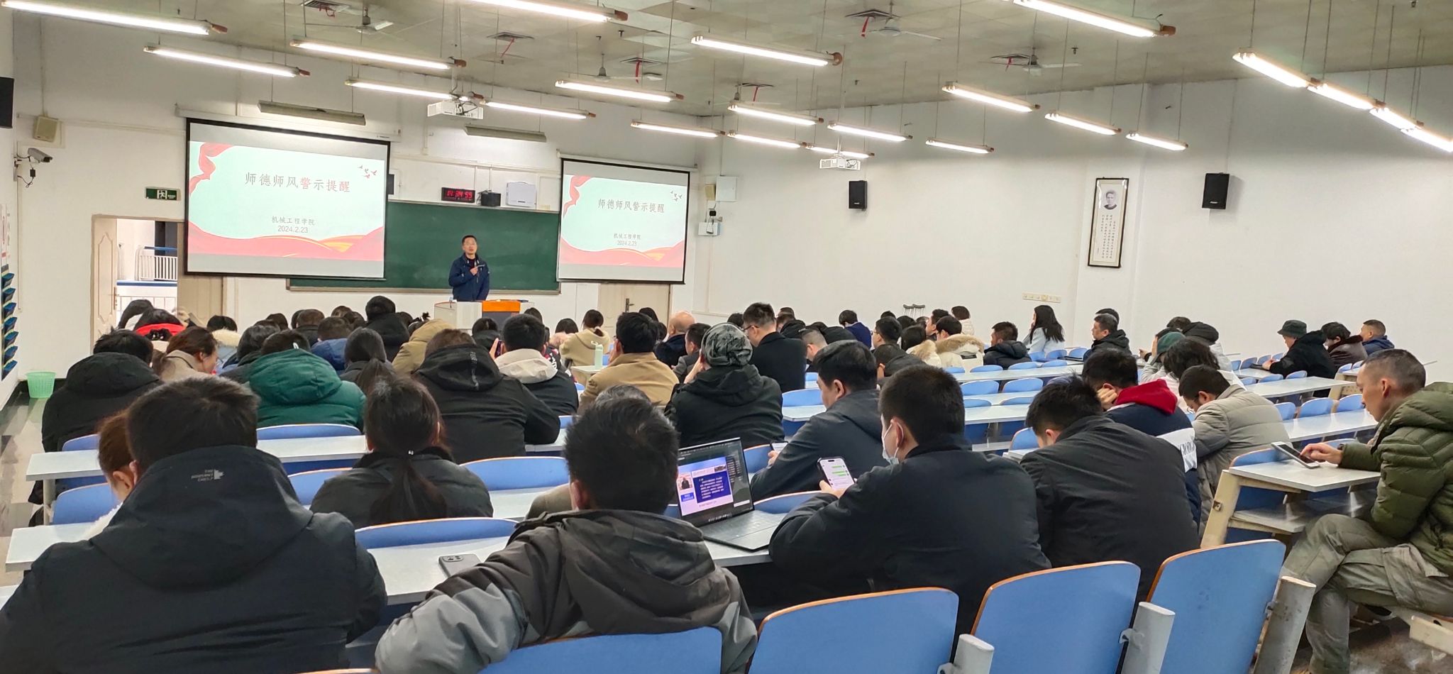 2024年2月23日,新学期开学第一天。为进一步加强师德师风和纪律作风建设,弘扬优良师德师风,强化典型案例警示教育,营造良好从教环境,切实落实立德树人人才培养责任,800cc全讯白菜网主站召开新学期师德师风警示提醒教职工大会。会议由学院党委书记杨娟主持。